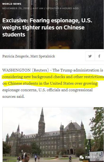 据路透社报道,因为担忧中国留学生从事间谍活动,特朗普政府中的有关人士,准备对中国留学生进行背景审查和增加其他的约束限制。