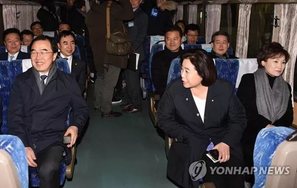 韩方为北上列车举行欢送仪式。统一部长官赵明均(左一)、国土交通部长官金贤美(右一)、国会国土交通委员会委员长朴顺子(右二)等参加仪式,并登上列车。