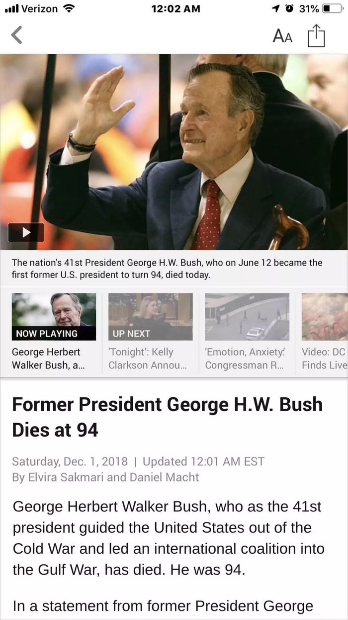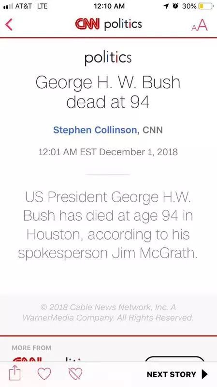 美国当地时间2018年12月1日,CNN等多家美国媒体发表声明:前美国总统乔治·赫伯特·华克·布什(George Herbert Walker Bush)于上午12:01晚间去世,享年94岁。