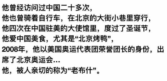 自从1993年卸任总统职务离开白宫后,老布什到中国访问了21次。2008年,他以美国奥运代表团荣誉团长的身份,出席北京奥运会。那是他对中国的第22次访问。