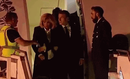 当舱门打开,和马克龙亲切握手的,居然是一个穿黄马甲的工作人员。