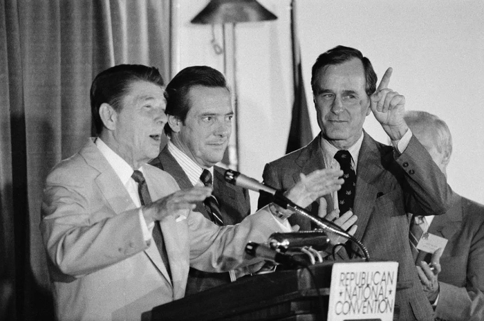 △1980年,共和党总统候选人罗纳德·里根(左一)和副总统候选人老布什(右一)一起亮相。