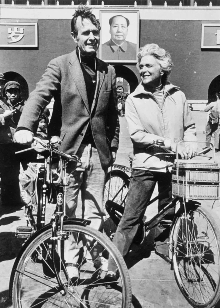 1974年,老布什与他的妻子芭芭拉骑自行车经过北京天安门。当时的老布什任美国驻中华人民共和国联络处主任期间经常与妻子骑自行车在北京的大街小巷穿行。