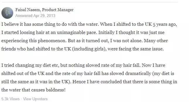 说英国的水质硬,里面含矿物质太多,导致脱发。这个主流的解释也有很多人有反驳,说中国有些地方的水质也硬,但没有这种问题,所以一直争议不断,没有定论。