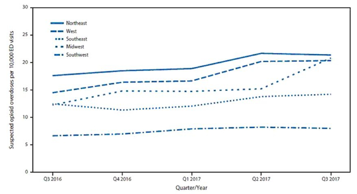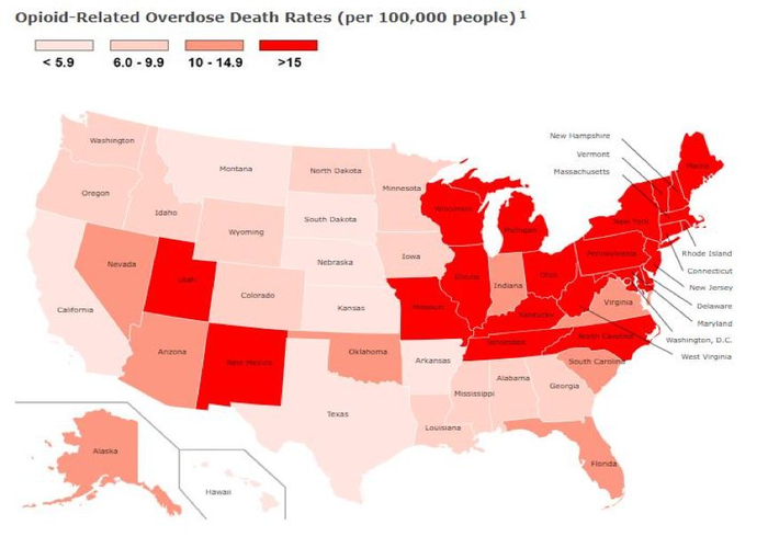 鸦片类药物滥用的死亡率也呈现上升趋势。在鸦片类药物滥用的高发地区,美国东北部,所致的死亡率高达每十万人中有15人或更多。全国范围内,则有高达30个州的鸦片类药物滥用死亡率高于每十万人中10人。