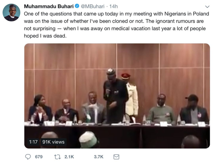 其后,布哈里在推特上置顶一条推文,称“今天在波兰与尼日利亚人举行的会议上有人提了个问题,问我是否被‘克隆’。这些愚蠢的谣言并不意外,去年我去接受治疗时,许多人希望我死了。”