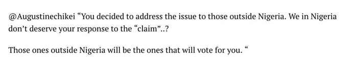 据《尼日利亚每日邮报》,有网友称:“你决定在离开尼日利亚之时回应这个问题,我们在尼日利亚的这些人不值得你作出回应吗?也许这些不在尼日利亚的人可能会是为你投票的人吧。”
