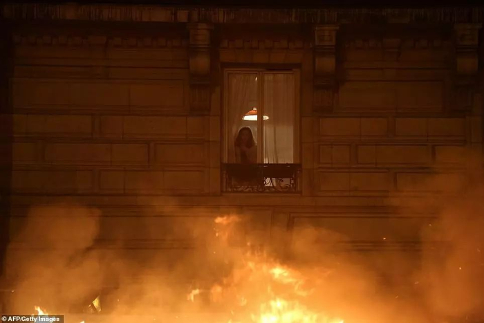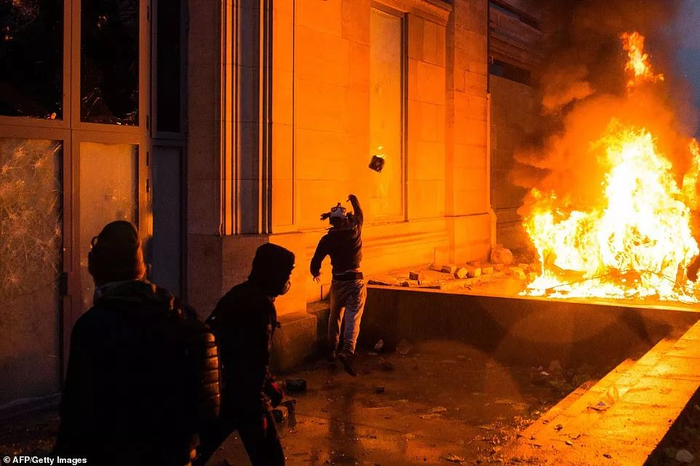 在暴动中,美术馆窗玻璃被打破,一名抗议者冲着火堆扔砖。