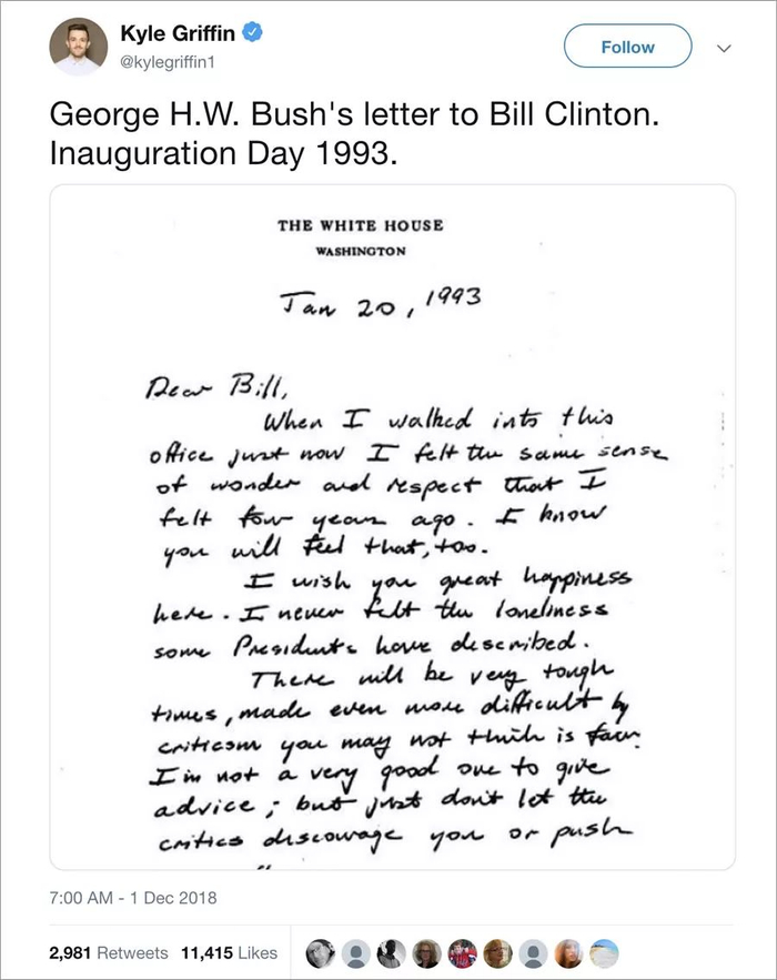 可是老布什的信不太一样,他的言语里有难得的真情流露,可以看出他是真心实意地希望克林顿能够成为一名好总统。