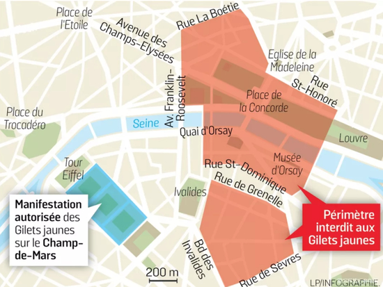 在吸取了11月17日骚乱教训的基础上,巴黎警察局给出了一个黄马甲的游行半径▼
