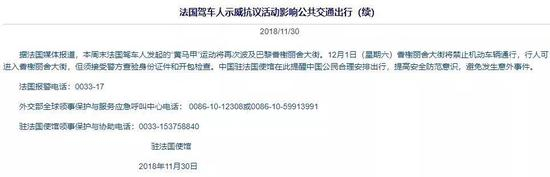 针对黄马甲运动,中国驻法国大使馆连续两个周末提前发布提示,都是从抗议活动影响公共交通出行的角度,并未发布旅行警告。