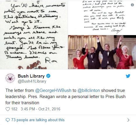 后来,老布什便将此延续, 离任时给克林顿这位民主党派的政治对手写了信,表示支持。所以, 留信传统在美国也只是近30年的事情, 但这种向对手表达友情的方式,意义深刻, 鼓舞民心。