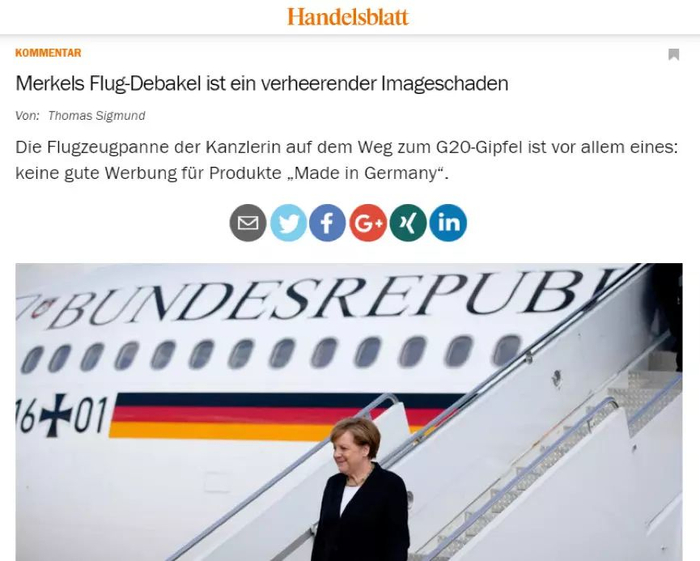 这件事引起了不少媒体的关注,毕竟除了行程延误导致迟到,领导人的飞机出故障更不是小事。很多德国媒体对此更是感到气愤,认为默克尔的专机出事损害了“德国制造”的声誉,给德国丢了脸。德国《商报》报道称:默克尔专机出事损害了德国形象。德国还列举了过去这几年德国官员遭遇的一系列飞机故障事件,例如德国总统施泰因·迈尔出访时就曾因专机出现故障而延误,今年十月,副总理舒尔茨在巴厘岛参加完国际货币基金会议后不得不搭乘民航客机返航,因为停在印尼机场的德国政府专机“阿登纳”号被老鼠咬坏了重要电路。可以说,德国媒体们对此事是极其不满,纷纷批评。