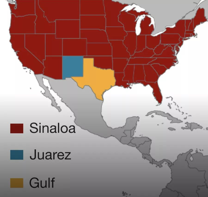 美国本土48个州,除了得克萨斯和新墨西哥被其他贩毒集团掌控,其余全部是Sinoloa的势力范围。