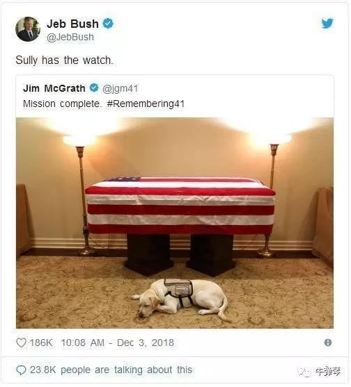 在老布什的葬礼上,他的爱犬“萨利”(Sully)静静地趴在老主人灵柩旁。老布什发言人吉姆·麦格拉斯,则为这只忠诚的服务犬配音说——“我的任务完成了。”