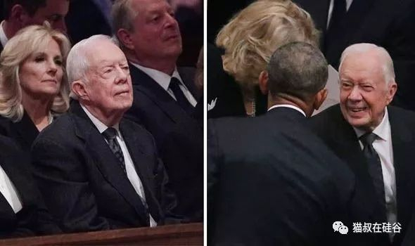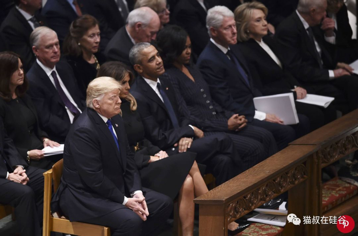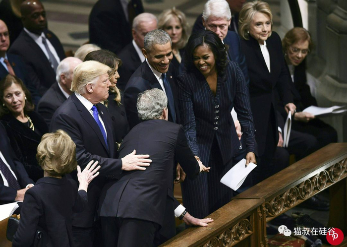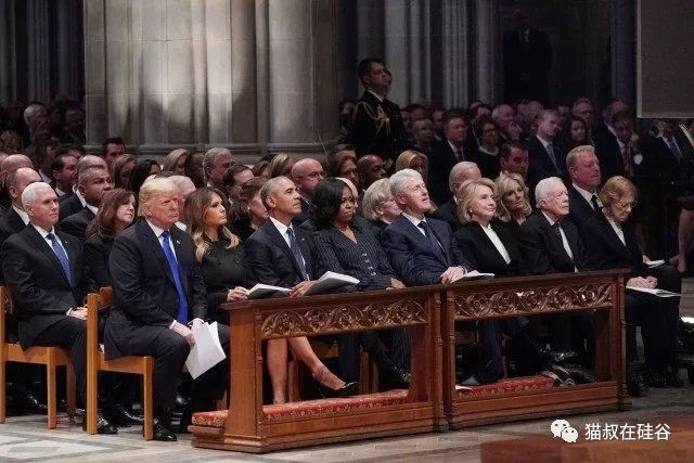 按照惯例,美国历任总统都出席了老布什总统在国家大教堂的追悼仪式;卡特总统夫妇、克林顿总统夫妇、奥巴马总统夫妇和特朗普总统夫妇按照就职顺序在第一排就座。虽然奥巴马夫妇和特朗普积怨多年,甚至公开指责,但在这样的场合,前任总统和现任总统本着对老布什总统的尊重,平和地坐在了一起。