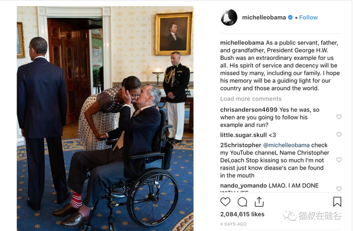 在老布什总统去世之后,奥巴马夫人在Instagram上发布了一张她在白宫椭圆办公室附身被老布什总统亲吻的照片表示怀念。她写道,“作为一位公仆、父亲、祖父,老布什总统是我们所有人的杰出楷模。他的风险和风度精神会被许多人所怀念,包括了我们一家。”
