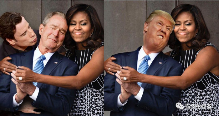 不过,外界关注到奥巴马夫人和小布什总统的这种意外友情,是从2016年10月的非裔美国人国家博物馆开幕活动开始的。当时,当着现场观众的面,奥巴马夫人从背后给了小布什总统一个友好的拥抱,而小布什总统一脸温柔的微笑;站在一旁的奥巴马似乎在惊讶地吐着舌头。这个瞬间立即引起了互联网的热议和调侃。诸多PS照片层出不穷。
