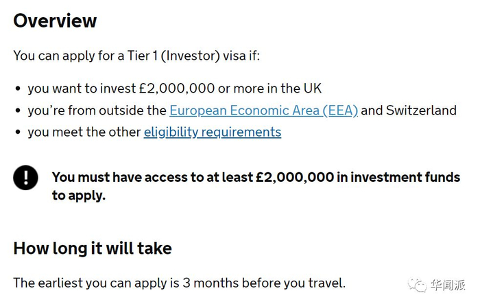 但是截至华闻君发稿时,在英国内政部关于200万英镑投资移民政策的相关网站上,依然没有关于暂停这个项目的信息,只是表示如果申请人能投资200万镑、申请人来自欧盟以外并且满足相关的要求,就能申请这个签证。