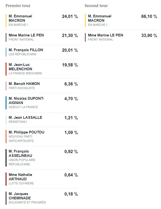 2017年法国大选二轮选举中,弃权、无效和白票率达34.03%(25.44+8.59),接近1968年五月风暴后的第一次总统大选(35.57%)。有效票中,支持马克龙的选民也只有2/3。总统上任后,6月11日法国国民议会选举一轮投票弃权率过半,创下1958年法国第五共和国以来最高的弃权率。当时就有媒体指出,马克龙的总统宝座隐患重重。