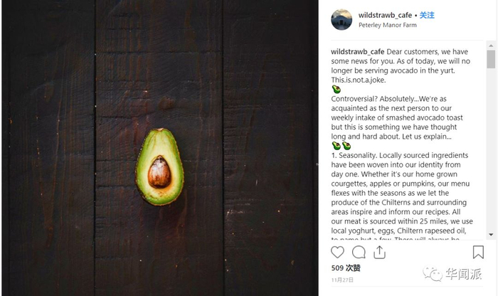 在Instagram上,餐厅主人Katy Brill发了一篇长文,声明从今往后,再也不供应牛油果了。在文中,她写到,他们供应的食物坚持就地取材,“除了意大利橄榄油和希腊羊奶酪,食物大多产自在餐厅25英里的范围内”。但是牛油果这一食材却要从远至5000公里之外运来,这在全球变暖的今天显得不合时宜。