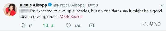 首先,大家的焦点都在牛油果和毒品的关系上。英国著名电视主持人Kirstie Allsopp发推称:“我应该拒吃牛油果吗?为什么没人建议大家不要去吸毒呢?”