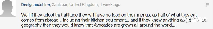 还有人表示,Katy Brill的说法站不住脚,“他们菜单上一半的食物都是进口的,包括厨房里的用具,如果他们学过地理的话,应该知道全世界很多地方都产牛油果。”
