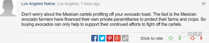 还有网友说,根本就不需要担心墨西哥黑帮会从牛油果交易中获利,“事实是,牛油果交易帮助墨西哥农民建立自己的准军事组织来保护他们的农场和庄稼。所以购买牛油果反而会帮助他们对抗黑帮。”