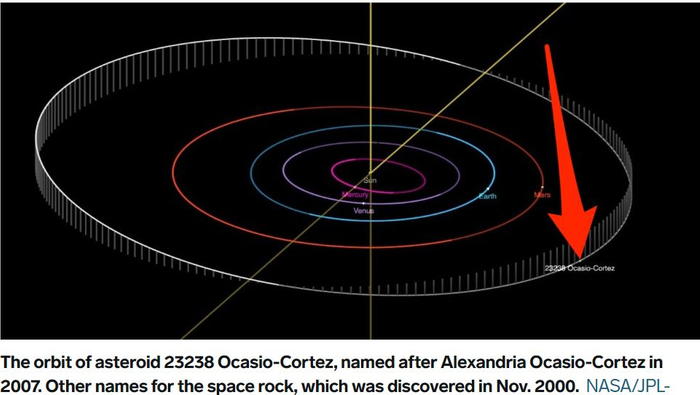 下图就是 NASA 提供的,这颗编号为23238 Ocasio-Cortez的小行星的轨道。。。