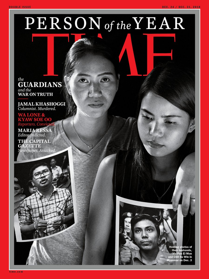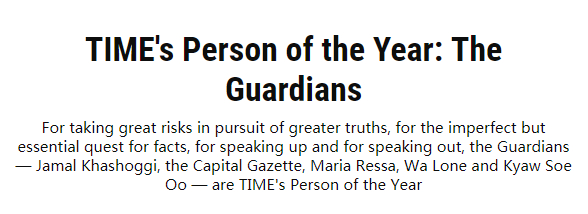 12月11日,美国《时代》周刊杂志公布2018年年度人物——那些“为了追求更伟大的真理,为了对事实真相不完美但至关重要的追寻,承受风险,勇敢站出来大声疾呼的卫士们。”
