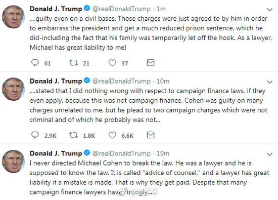 科恩被判刑后的第二天(13日),特朗普发推称,科恩认罪就是为了让自己难堪,以及达到减刑目的。
