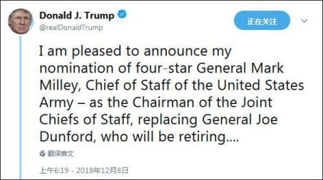 特朗普在推特中向马克·米利和约瑟夫·邓福德这两位为美国做出贡献的将军表示感谢,并称两人的“交接日期待定。”按照程序,马克·米利的提名还须得到美国国会参议院投票批准。