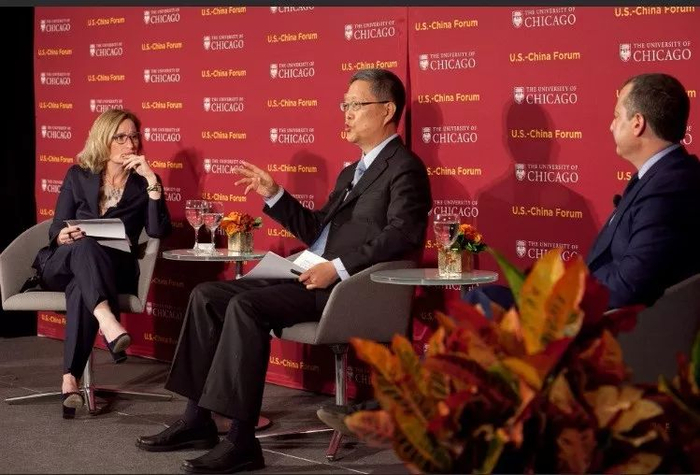 2016 年10 月,何亚非(中)出席在芝加哥大学举办的第二届中美论坛。