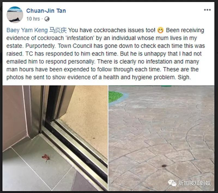 有趣的是,国会议长陈川仁也在面簿上呼应说,他也面对类似的蟑螂问题。陈川仁说,最近收到一名居民发过来的“螂侵”证据,该居民每次提出问题,市镇会都会下去检查,每次都会回应,但对方因为国会议员没有亲自以电邮回复而感到不开心。