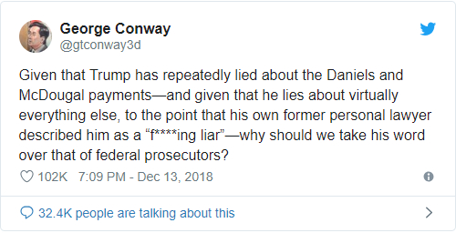 鉴于特朗普一再对付款给丹妮尔斯和麦克多格的事情撒谎,并且考虑到他在几乎所有其他事情都撒谎,以至于他自己的前私人律师说他是”他妈的骗子’ —— 那我们有什么理由相信他的话,而不相信联邦检察官呢?
