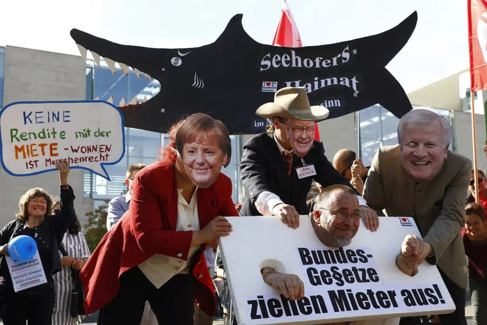 △ 9月21日,德国柏林,示威者头戴面具扮成德国总理默克尔、美国投资人沃伦·巴菲特和德国联邦内政部长霍斯特·泽霍费尔在总理府抗议住房短缺。 来源:视觉中国