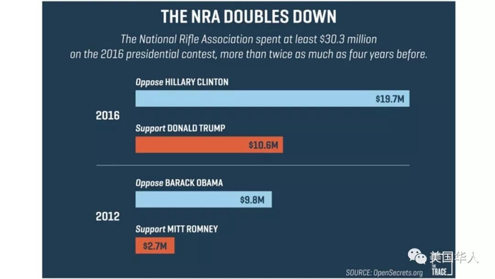 目前,NRA最受怀疑的是,在2016年的大选中,为特朗普竞选团队赞助的3100万美元 —— 这个数字比上次共和党候选人罗姆尼的支持上升了近2倍多。