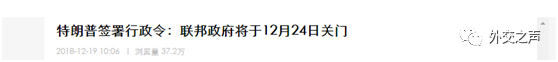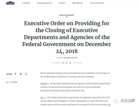 近期,围绕美墨边境墙预算问题,美国总统特朗普和国会民主党僵持不下,如果21日午夜最后期限前无法达成妥协,美国联邦政府面临年内第二次部分关门风险。而据白宫官方网站消息,特朗普12月18日发布行政令,宣布联邦政府将于12月24日关门,所有行政管理部门和政府机构将关闭。