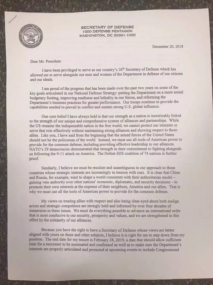 马蒂斯在辞职信中对特朗普说:“您有权拥有一位与您意见更为一致的国防部长,所以我相信,我的辞职是正确之举。”他同时建议特朗普尊重盟友并加强与盟友关系以更好地维护自身利益。短短的两句话点明了马蒂斯辞职的主要原因。