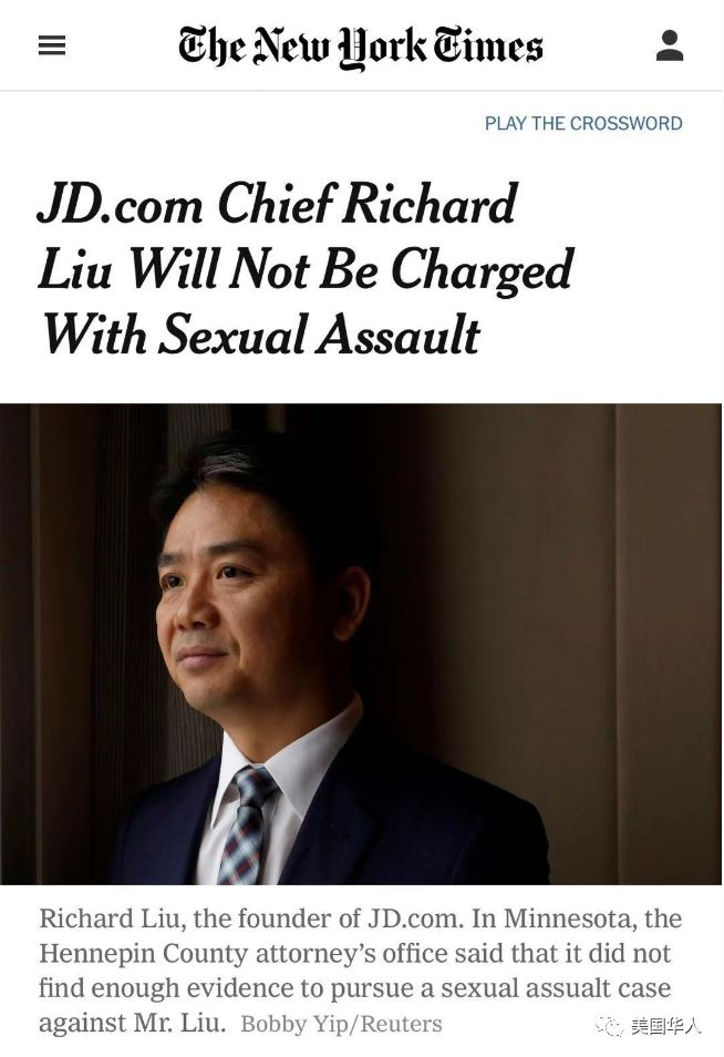 《纽约时报》报道刘强东将不被起诉性侵。(《纽约时报》截屏。)