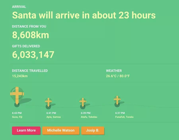 每年圣诞节,我都会打开Google上这个追踪圣诞老人的页面。网页上标记着圣诞老人在送礼物途中的实时位置,每分每秒都会更新。