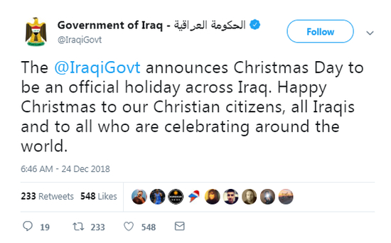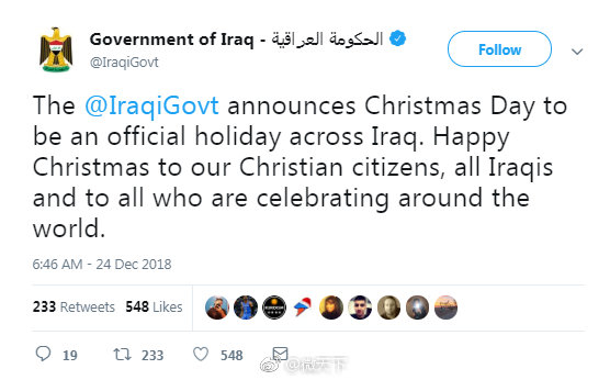 CNN25日报道,根据伊拉克政府发布的一份声明,伊拉克内阁批准了一项法律,正式将12月25日的圣诞节定为全国各地的公共假期“耶稣诞生日”。伊拉克政府在推特上说:“祝我们的基督徒公民、所有伊拉克人及全世界庆祝这个节日的人,圣诞快乐!”