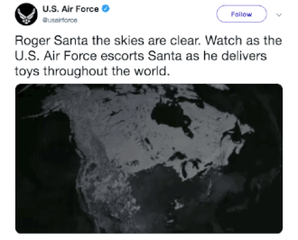 美国空军的官方推特24日晚发了一个短视频称,美国空军正在给圣诞老人护航。