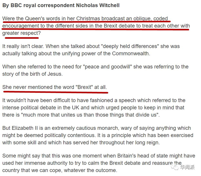 BBC的王室评论员Nicholas Whitchell评论称,伊丽莎白二世是一位极其谨慎的君主,对任何可能被视为具有政治争议的言论都持谨慎态度。并且这种态度贯穿在她漫长的统治期间,她都在用一种巧妙的手法来为她服务。尽管女王对“脱欧”只字未提,但她在演讲中提到“当人们有根深蒂固的分歧”,她敦促人们记住:“尊重对方,把对方当作人类同胞对待,总是朝着增进理解迈出的良好一步。”