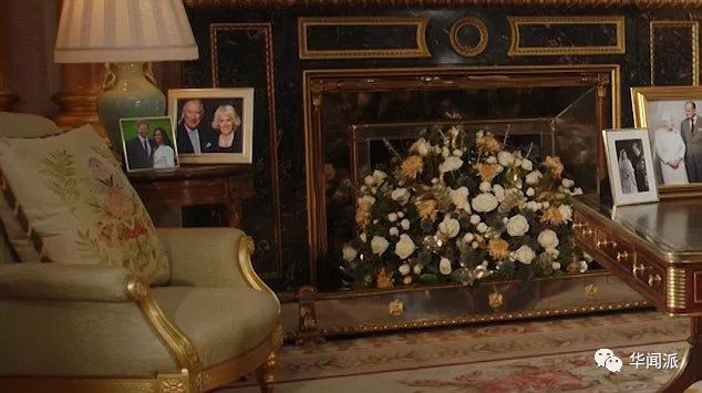 在不远处的壁炉旁边,镜头还拍到了两张照片,一张是查尔斯王子和卡米拉,还有一张就是哈里王子和当时还是哈里未婚妻的梅根宣布订婚时的合影。