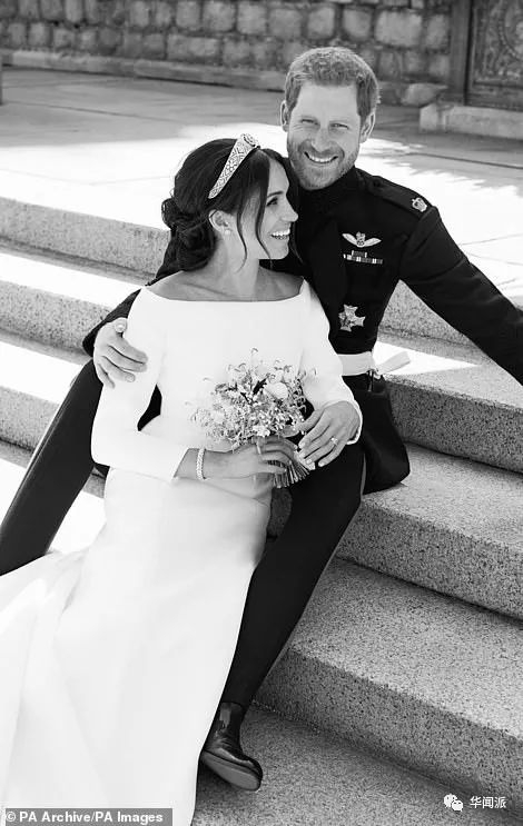 而在远一点的茶几上,则分别放着梅根和哈里结婚照↓↓