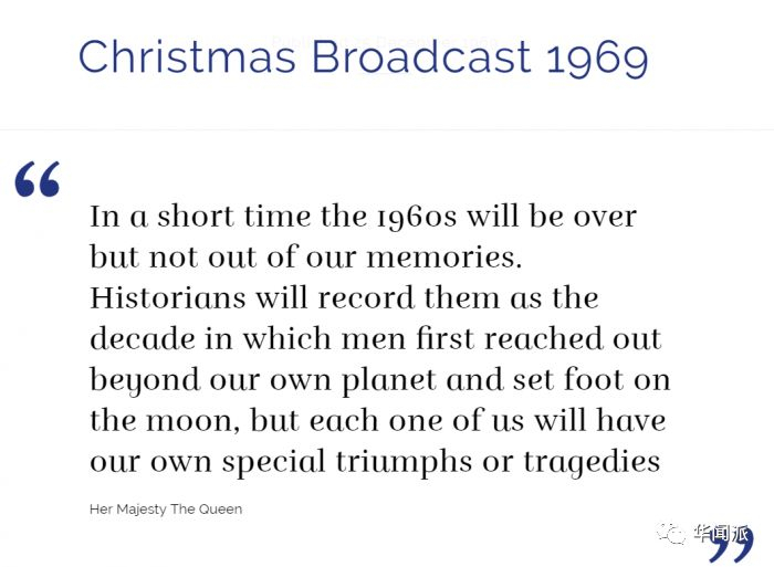 从1957年开始,女王的演讲开始以电视转播的方式向全世界直播。唯一的例外是1969年,她写了一封信替代了圣诞演讲↓↓