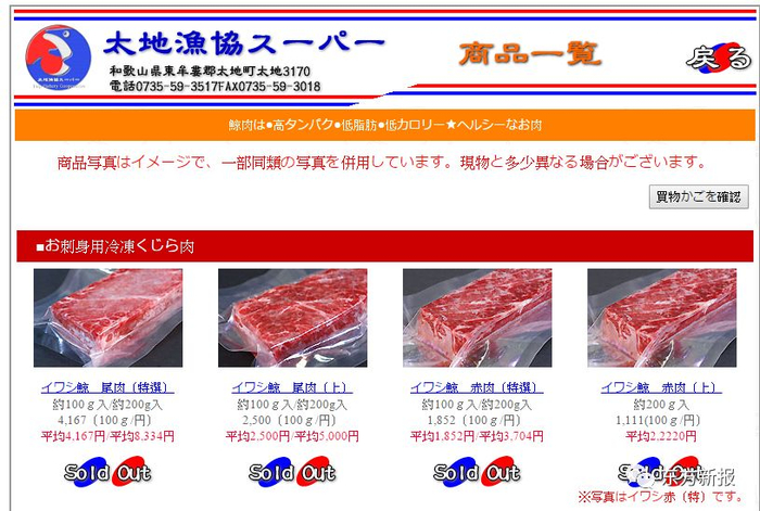 太地渔协超市网站上明码标价的鲸鱼肉,并且全部“售空”