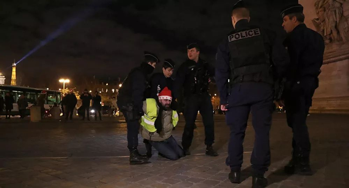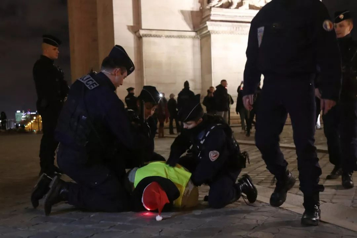 12月24日晚,有民众穿黄衫在凯旋门涂写标语,被警察制服。(俄罗斯卫星网)