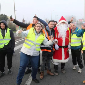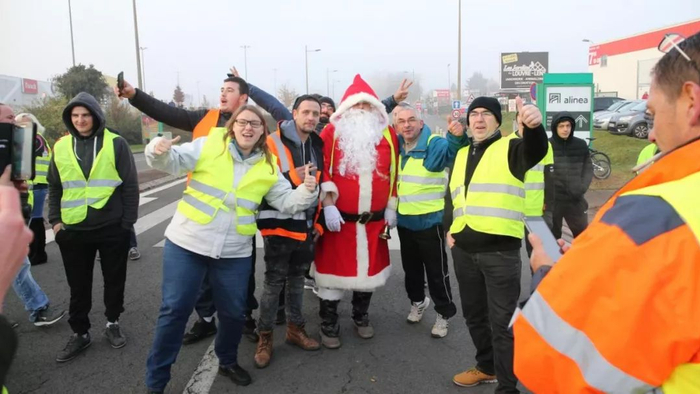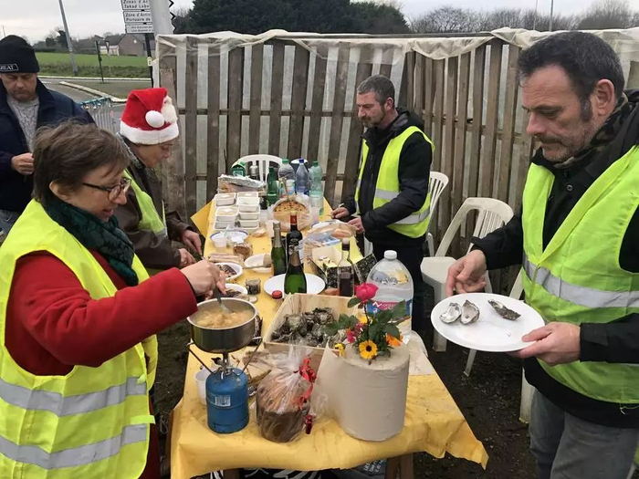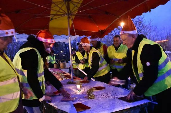 12月24日圣诞前夜,不少支持黄衫运动的人士为坚持斗争的“黄衫军”送去节日盛餐:“他们是为我们、为所有法国穷人坚守在这里,应该支持他们”。有人扮成圣诞老人对黄衫表示支持。有“黄衫驻军”表示,由于生活困苦,家里已经好多年买不起鹅肝和香槟过圣诞了。(法新社、西部法兰西)